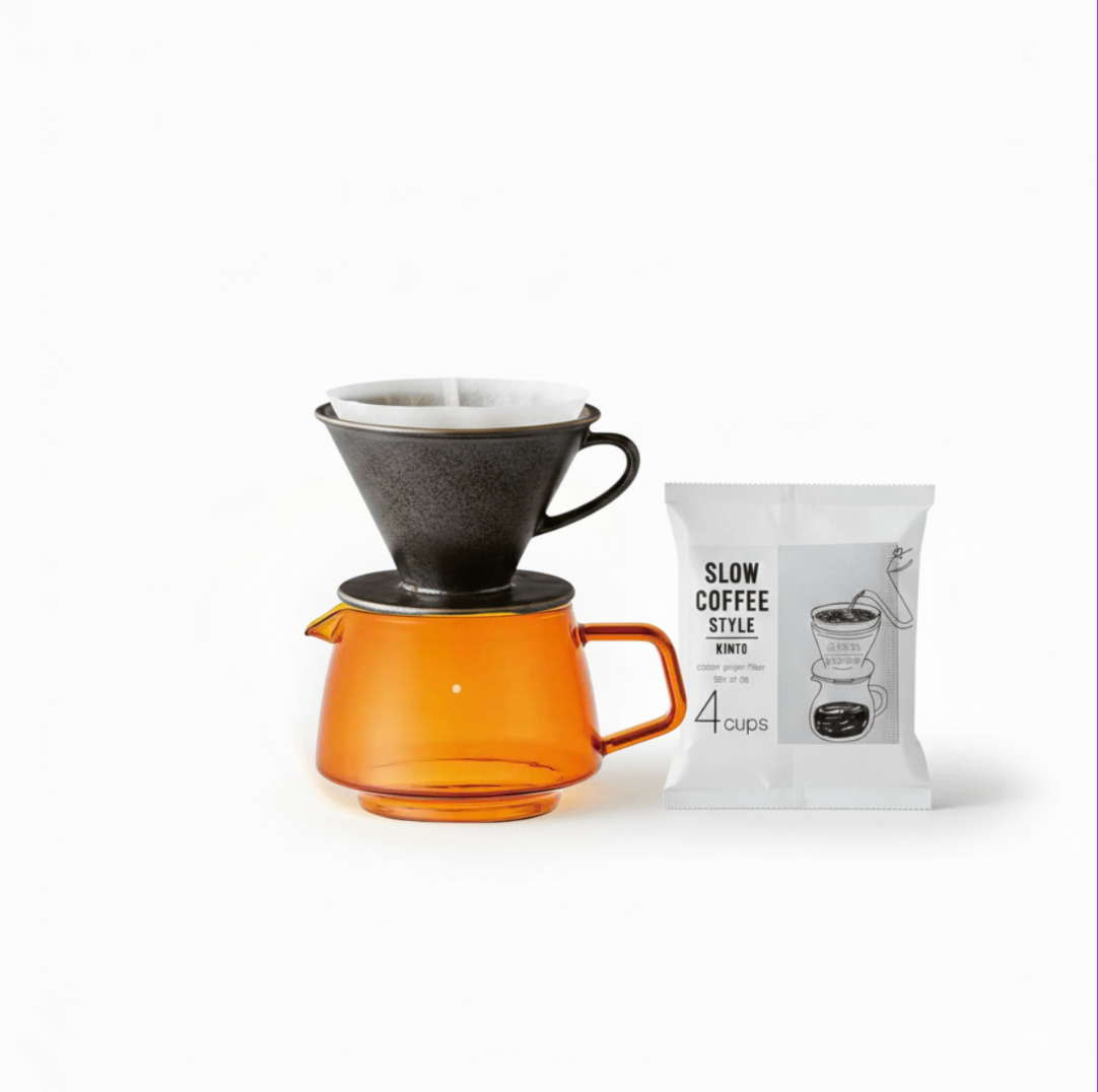 A Kinto Slow stílusú főzőkészlet négy csészéhez. A csomag tartalmaz egy 600 ml-es Kinto Sepia üvegkannát, egy kerámia slow style scs-s01 szűrőt négy csészéhez, valamint 60 darab szűrőt. Tökéletes választás, ha egy egyszerű, használatra kész öntős kávékészletet keresel!