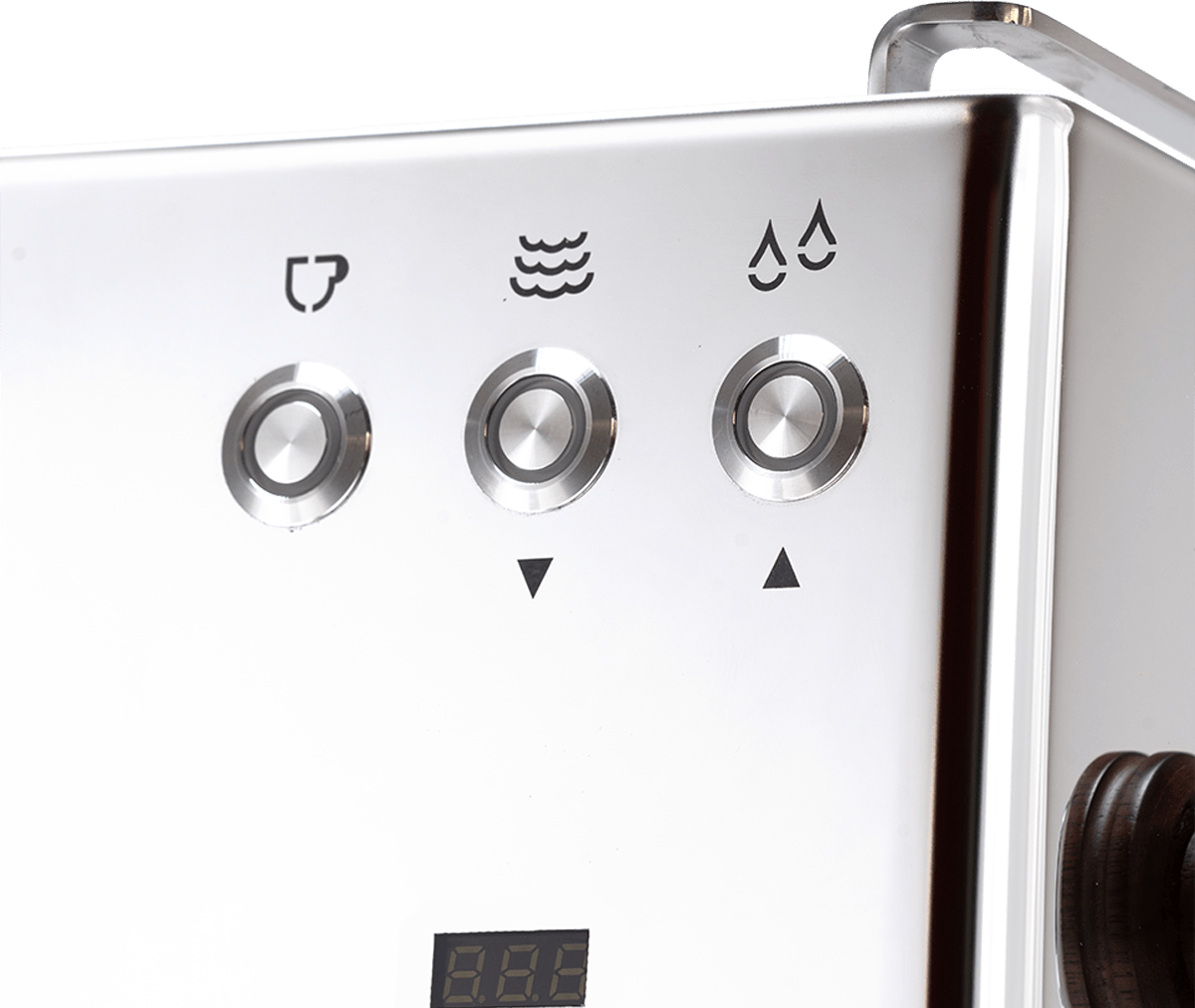 A beépített kijelző mutatja a hőmérsékletet, a shot időzítőt és a beállításokat. A gép programozható előáztatást, készenléti módot és energiatakarékos üzemmódot is kínál a rugalmas használat és energiahatékonyság érdekében.